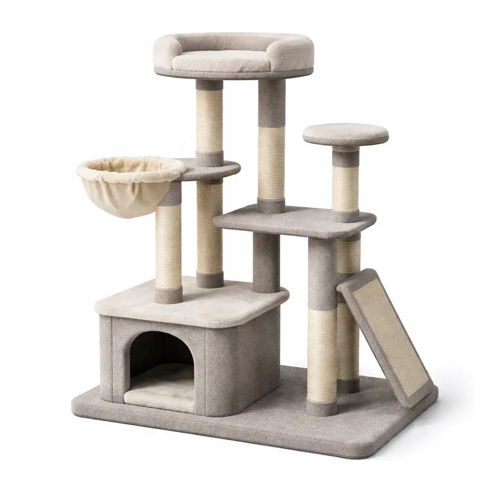 Cet arbre à chat adopte une structure à plusieurs niveaux, combinant des fonctions de repos, d’escalade et de grattage, et convient à un usage en intérieur.